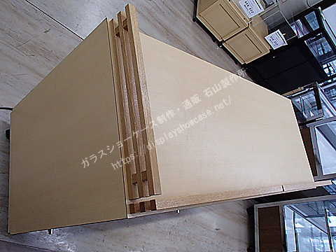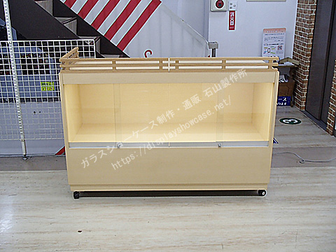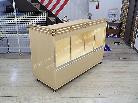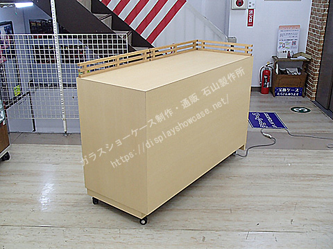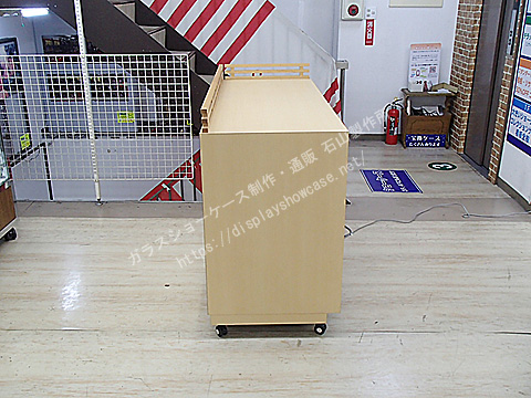このケース2台に加え、逆のL字柵になっている2台があり、4台をひと繋ぎにするとW3000xD1200の大きな展示台になるためです。