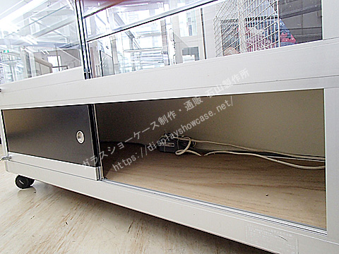 棚柱が無い設計なので壁付けの前引き戸としても対面販売用の後ろ引き戸どちらでもご使用頂けます。