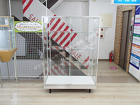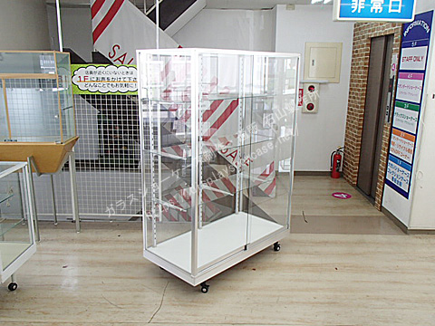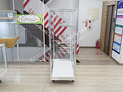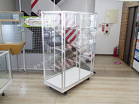 KKK スタンダード 立ケース アルミ シルバー 棚3枚 前引き戸 背面ガラス キャスター 棚板追加不可