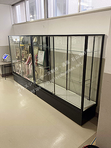 教育施設にブラックの標準型ショーケースの立ケースを2台納品しました。